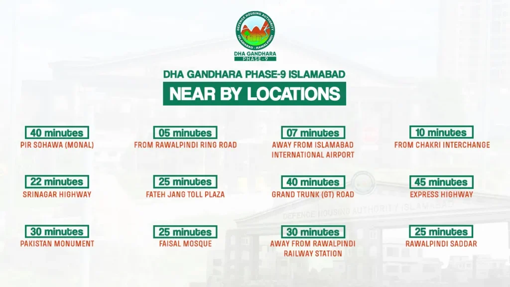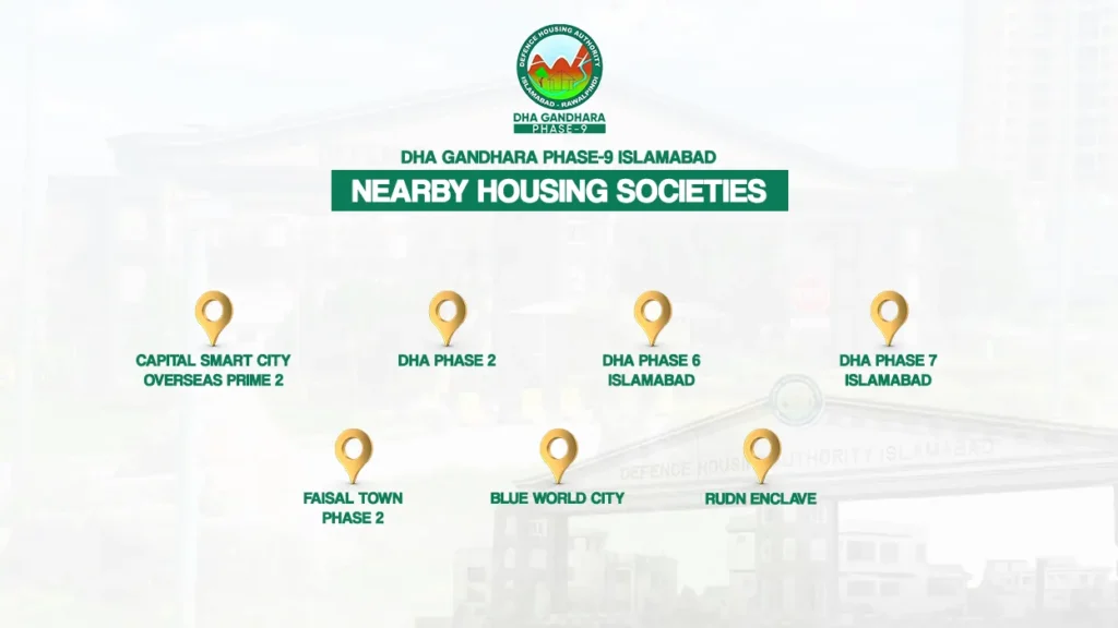 These nearby societies make DHA Phase 9 part of a thriving residential zone in the twin cities.